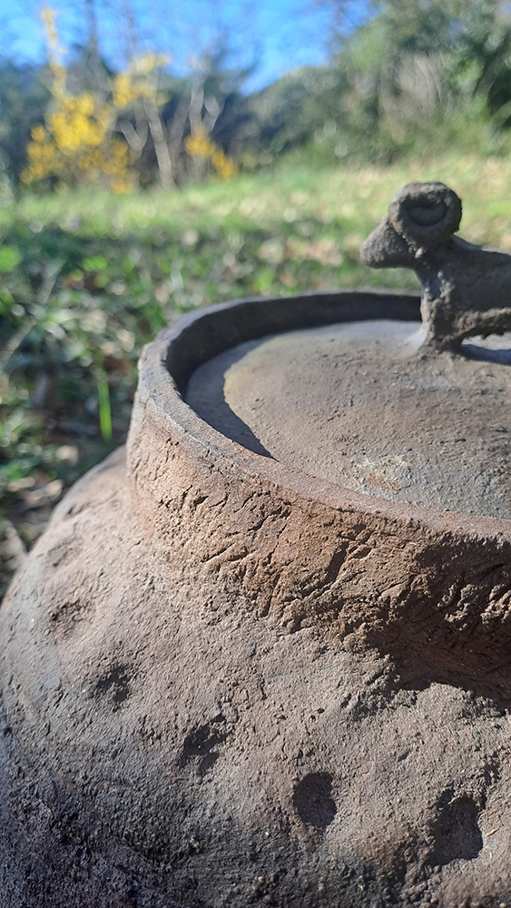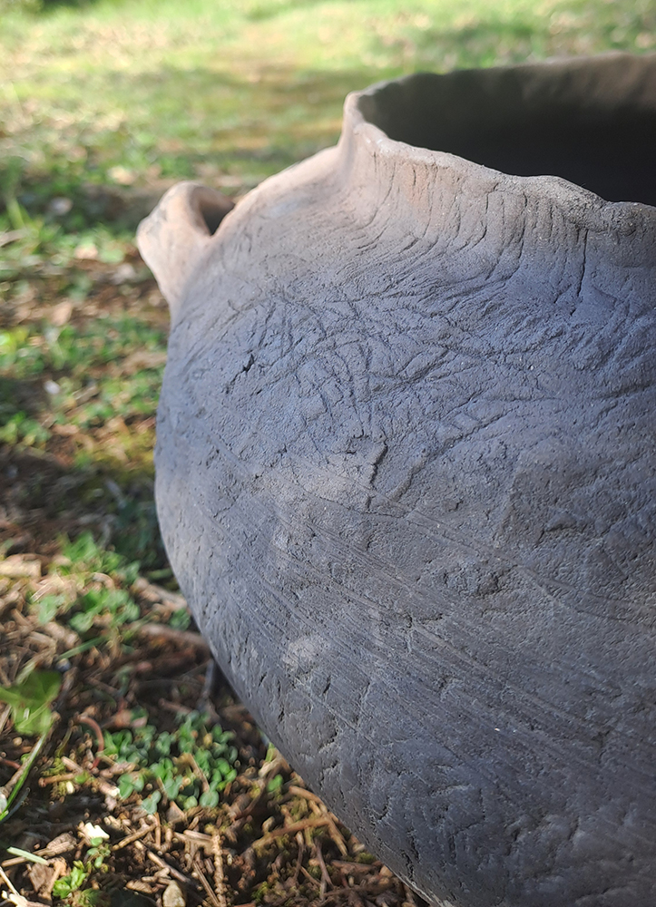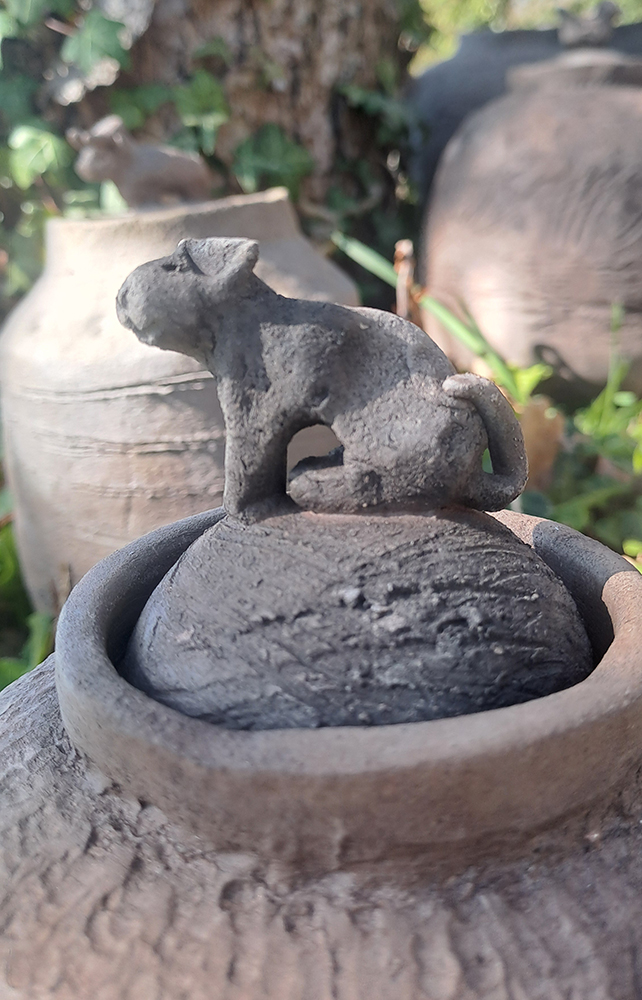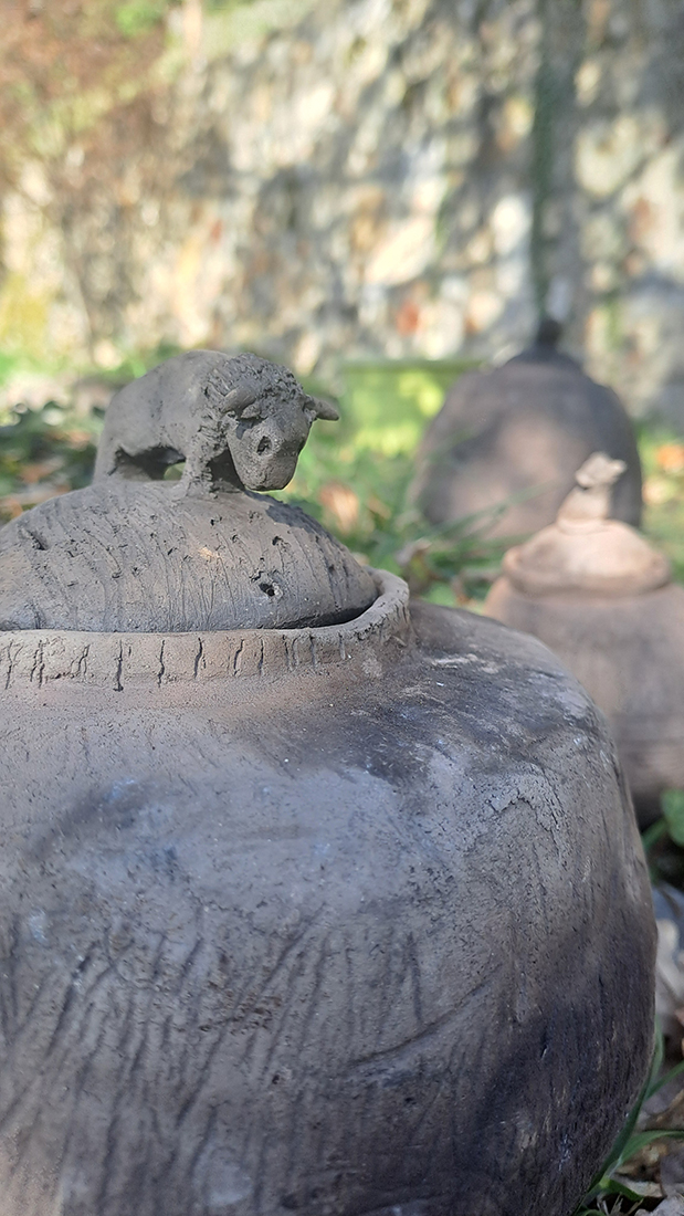 Je vous présente ici deux univers, l’un utilitaire et l’autre décoratif. Pour la collection de poteries utilitaires j’utilise un grès blanc pyrité qui me permet d’amener de la chaleur à mes poteries. La sobriété des décors permet un panachage, que ce soit des paysages ou des motifs plus géométriques. L’autre facette de mon travail, ce sont des jarres décoratives en grès roux ou noir, cuites à basse températures puis enfumées. Je renoue avec l’origine de la poterie en travaillant au colombin ou s’ajoute au hasard les couleurs de la fumée et de la flamme, c’est un vrai plaisir !