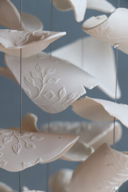 Je travaille aussi la porcelaine pour créer des mobiles-carillons qui sonnent délicatement. Les décors sont issus de mon univers graphique et sont posés en contre-empreinte sur de fins « pétales » de porcelaine nue. Chaque mobile a un son bien à lui, entre douceur et poésie… Mes mobiles sonnent délicatement, invitations au voyage…