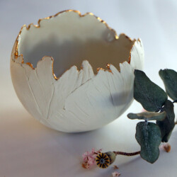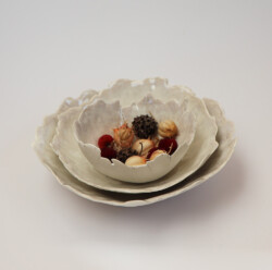 Je travaille par estampage principalement du grès brun lisse, du grès légèrement chamotté et de la porcelaine de Limoges cuits à haute température. Je façonne des pièces décoratives avec des formes arrondies chaleureuses très simples pour créer coquilles, coupes, jeux de coupelles de formats variés, vases. J’ai deux collections, « fleur de Pivoines » et « Craquelées ». Je joue sur les contrastes de matières, terre mate ou satinée, polie à l’agate à l’extérieur avec un émail brillant à l’intérieur, parfois un filet d’or posé sur la porcelaine suivi d’une 3eme cuisson.