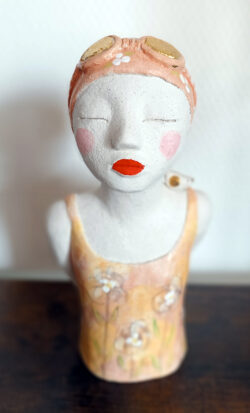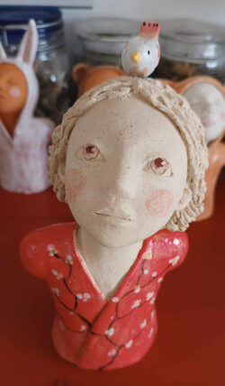 Artiste plasticienne de formation, j’utilise naturellement l’assemblage et je peux ajouter quelques fois à mes modelages des touches de peintures et de collage, des matériaux de récupération, des petits objets glanés de-ci, de-là, ramassés ou collectés. Ils m’apportent une liberté infinie dans ma création.
