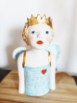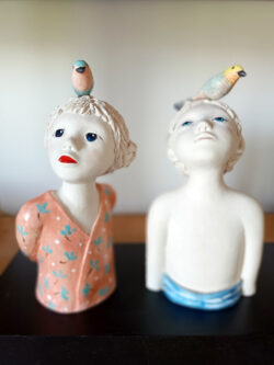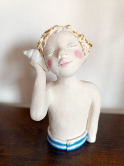 Je travaille le grès et les engobes pour modeler des personnages tournés vers l’enfance… Tendres, étonnés, rêveurs, pensifs, semblant traverser la vie entre gravité et légèreté.