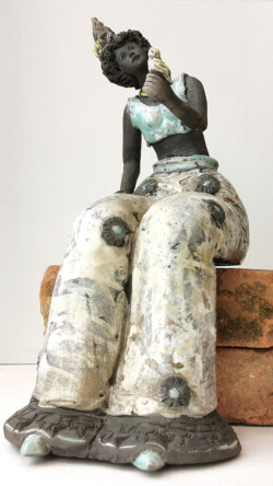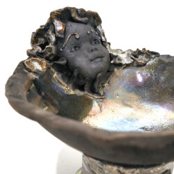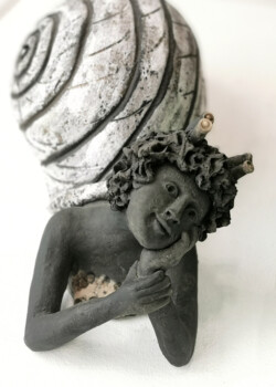 Mon travail avec la terre est une proposition de « voyage dans un monde de paix et de sérénité ». Les personnages animés de couleurs lustrées trouvent une place au coeur de la nature et du rêve. Jeux de lumière entre terre et émail, avec la technique du raku, brillant et mat : pour donner « vie » à ce petit monde… juste pour partager un instant !