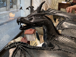 Notre vitrine originale est un clin d’oeil aux terres froides et volcaniques d’Islande, avec notre Dragonne de terre et de métal, petite habitante des plages de sable noir de Vik, création d’Emmanuelle Texier et Fred Dyon.