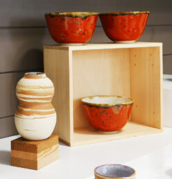 Nous accueillons aussi deux céramistes, Emilie Verhaegen et Cécile Tilly, toutes deux travaillant le grès, pour des objets du quotidien tournés, doux et agréables à regarder, avec une belle mise en valeur de la terre.